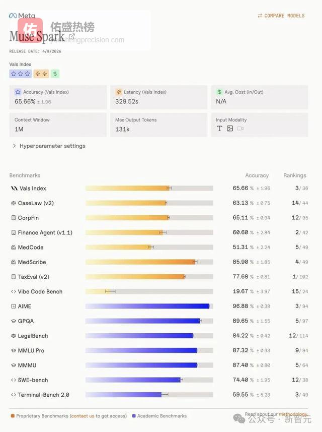 更值得一提的是,在Vals指数排行榜上,Muse Spark强势夺得第三名,具体指标如下。