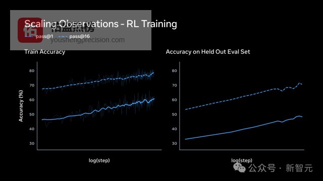 左图是训练集上的表现。pass@1和pass@16(16次尝试中至少对1次)都呈对数线性增长。