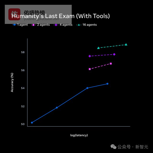 Meta的做法是扩展并行Agent数量,1个、2个、4个、16个Agent同时思考。