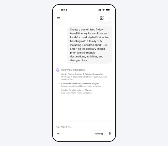 只需输入「帮我规划一个5口之家去佛罗里达的7天文化美食行程,3个孩子分别12、9、7岁」,Muse Spark就会同时派出三个子Agent,一个规划美食文化路线,一个搜索亲子活动,一个协调物流和住宿