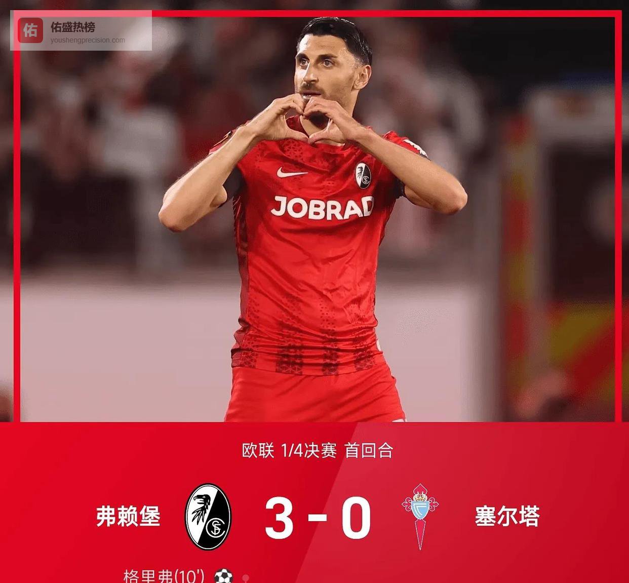 下半场塞尔塔总算醒过来一点,好歹有了3脚射门,但全都偏得离谱。 弗赖堡这边则踢得不紧不慢,直到第78分钟,他们才给了对手致命一击。 贝斯特开出角球,中后卫金特尔在人群中高高跃起,一记势大力沉的头槌,把比分改写成了3-0。 比赛至此,彻底失去了悬念。 终场哨响,弗赖堡球迷的歌声响彻夜空,一场3-0的完胜,几乎已经为他们预订了一张欧联杯四强的门票。