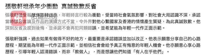 张敬轩这次也没藏着掖着,直接对着媒体把自己以前的错摆到台面上说了。他说年轻的时候受当时社会气氛影响,自己对社会大局认识不深,再加上年轻气盛说话做事都冲动,说了不该说的话,做了不合适的事,让外界对他很失望,他自己现在想起来也特别后悔。他还公开承诺以后绝对不会再犯同样的错,就想以身作则,给年轻一代做个正面榜样。