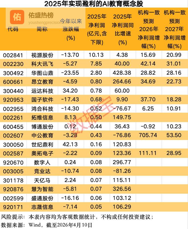 从单只概念股来看,披露净利润数据的32只概念股中,18股2025年实现盈利。10股2025年净利润均超过3000万元,视源股份、科大讯飞、华图山鼎2025年净利润均超过2.5亿元。