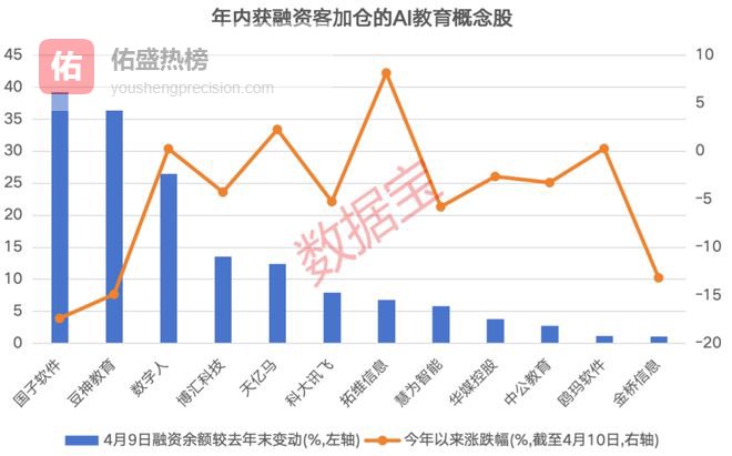 从融资资金来看,上述AI教育概念股中,4月9日融资余额较去年末有所增加的个股有12只,增幅超过10%的有国子软件、豆神教育、数字人等5只。
