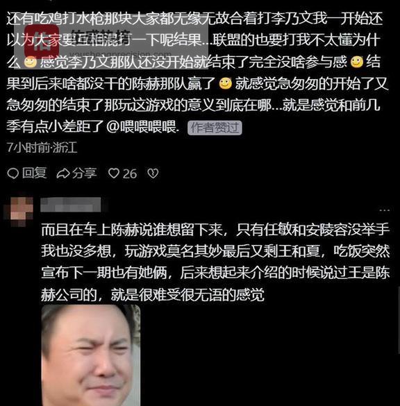 好多观众都在那儿嘀咕:“这请来的女嘉宾,怕不是来探班的吧?”说真的,这种纯男生凑一起闹腾的游戏,真该让他们单独找个时间录,别拉着女嘉宾在旁边干耗着。