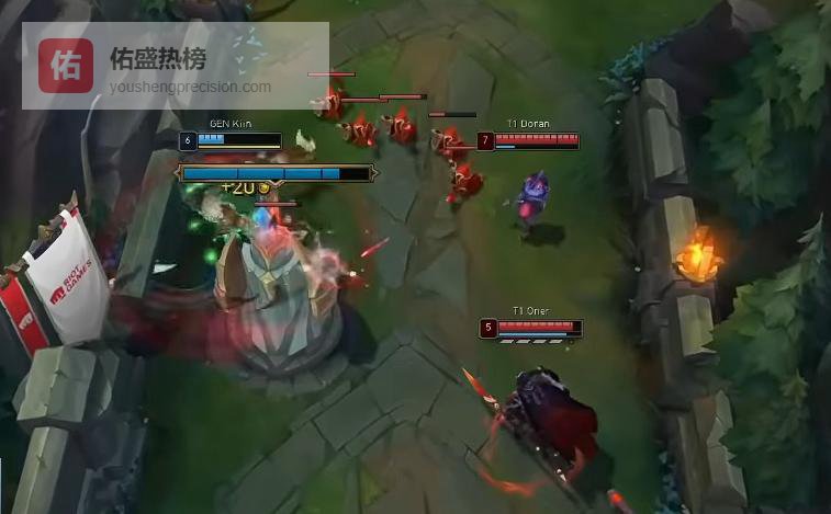接下来Canyon做什么?他就像这样跟对方玩一下,戳一下。他完全知道己方中下都有推线权。这时候T1队内语音大概是:打野在喊“我们怎么办?这是我的野区!我需要帮助!”Faker在喊“我要TP回中路了,我被Chovy打爆了!”下路在喊“我们下路是发育对局,你们得帮我们!”整个野区一片混乱,中路和下路也是混乱的。只有Doran在挠头想:我队友要崩了,我得自己打赢上路。