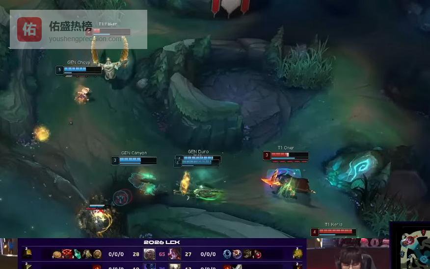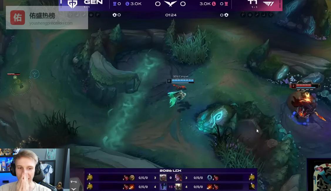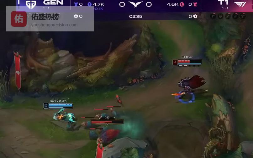 于是他们开打,Duro拿到人头。然后Peyz来得稍快一点——他玩的泽丽,能翻墙——但已经无所谓了,因为GEN在这个时间点更强。他们打赢了小规模团战,Duro先到,最终Duro拿下三杀。从这之后,Canyon就可以从上到下把自己的野全刷完,Oner也一样。区别在于Canyon野怪领先——他拿了双河蟹,还之前偷了Oner的石甲虫和锋喙鸟。所以Canyon会非常非常领先。2v2对GEN来说仍然没问题,Chovy仍然在中路统治。这一切都打得非常好。