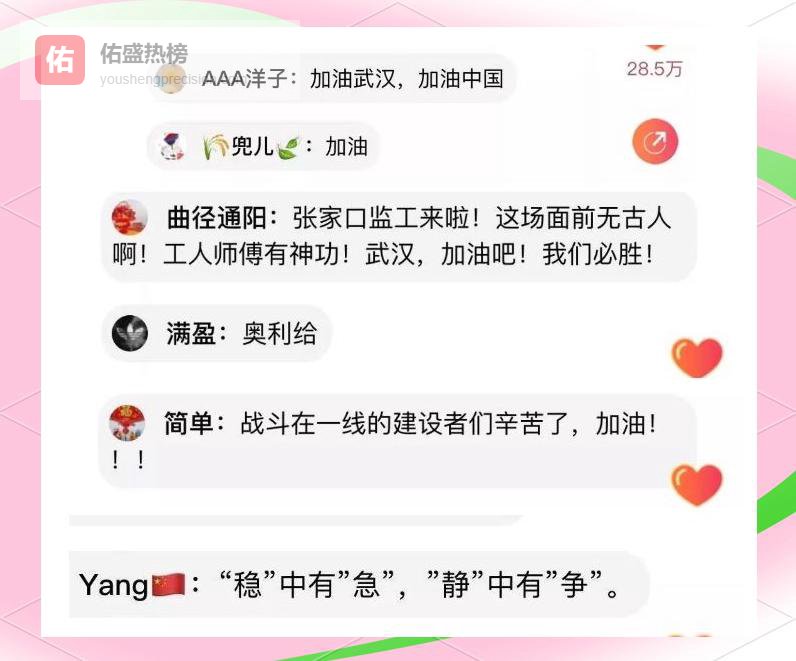 一边刷屏“稳中有急,静中有争”,一边把工地当综艺。有人实时统计“焊舞帝”出场时长,有人吐槽“蓝忘机”灯光太亮晃得焊枪睁不开眼。欢乐的讨论背后,是14亿人对疫情阻击战的共同牵挂——大家用调侃的方式为建设者点赞,也为自己加油。