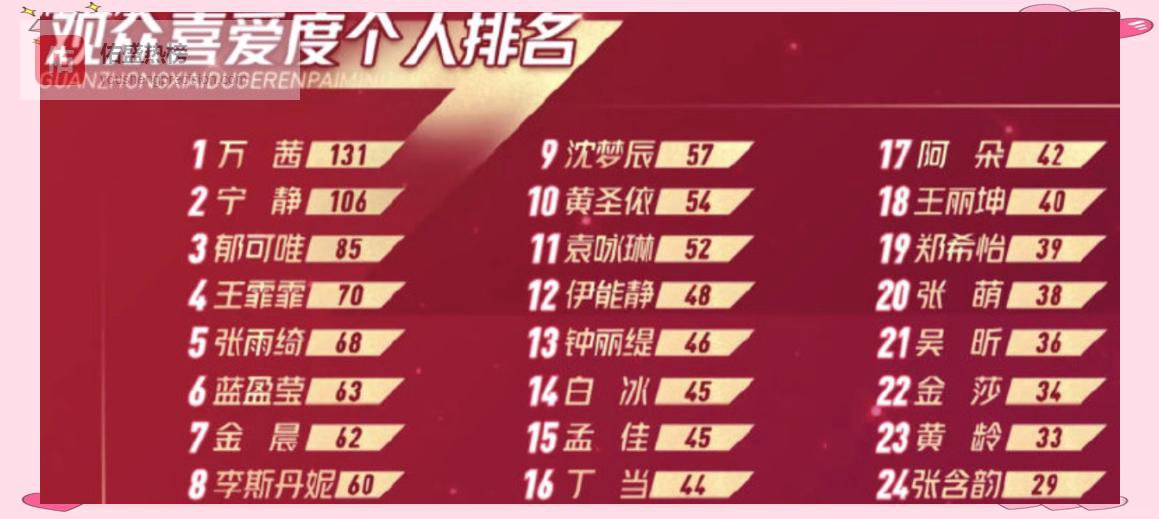 ❒ 人气逻辑跟不上镜头分量节目开播前,万茜存在感一般;公演舞台也未出现爆裂舞台。二公沈梦辰淘汰当晚,沈梦辰的亮眼表现反而盖过了万茜,这让不少观众困惑:她凭什么连续第一?