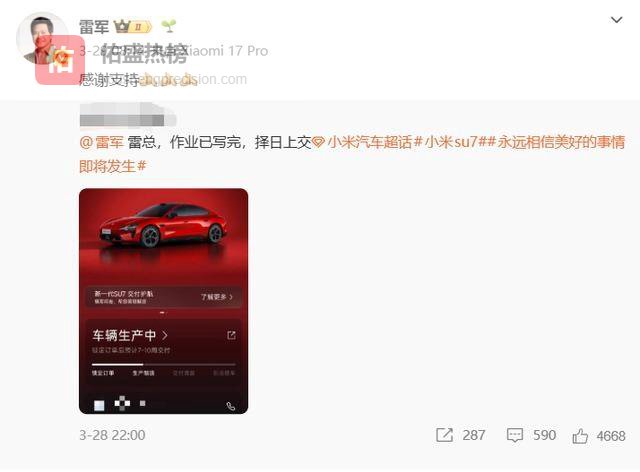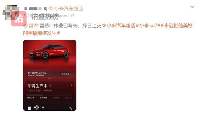 3月28日,他在微博上晒出了新一代小米SU7的订单截图,并@雷军说:“雷总,作业已完成,择日上交。”从截图来看,他选了一台赤霞红配色的小米SU7,搭配19英寸钻石轮毂与长续航轮胎,内饰选了同色系的暮光红,预计7-10周交付。这份“作业”,是用真金白银写出来的。