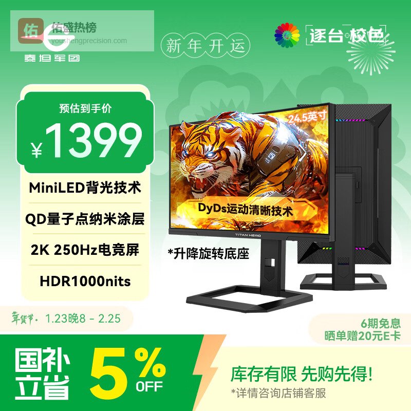 泰坦军团 24.5英寸 QD量子点纳米涂层 MiniLED 2K 升级250Hz HDR1000nits高亮DyDs电竞显示器 P245MS增强版¥