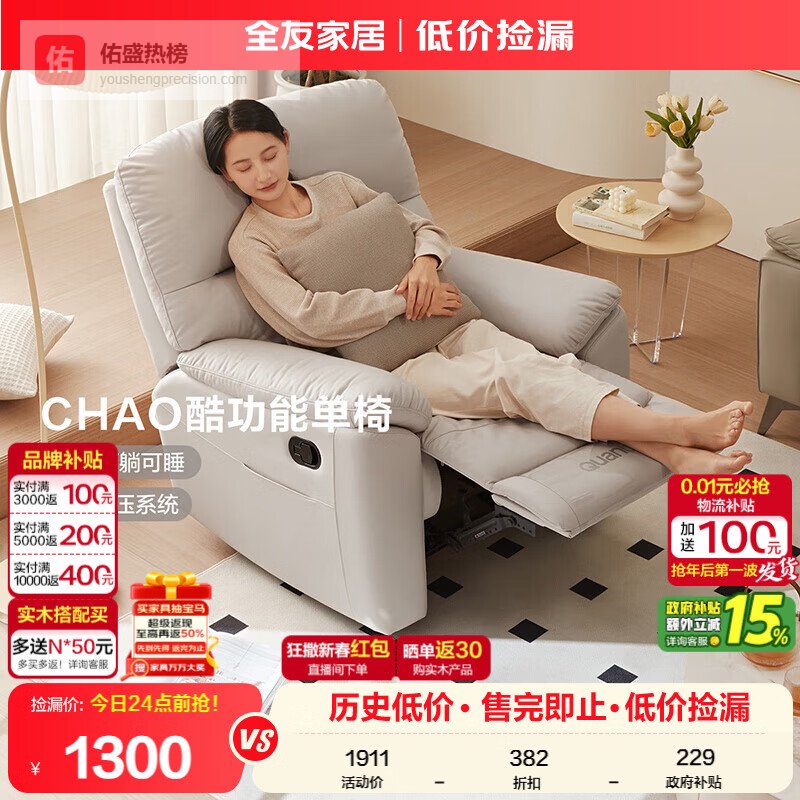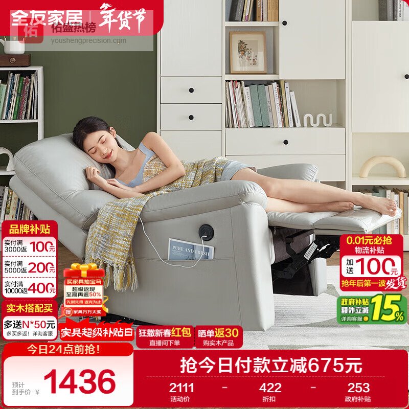 全友家居 多功能沙发简约客厅单人电动沙发椅可躺科技布沙发椅¥
