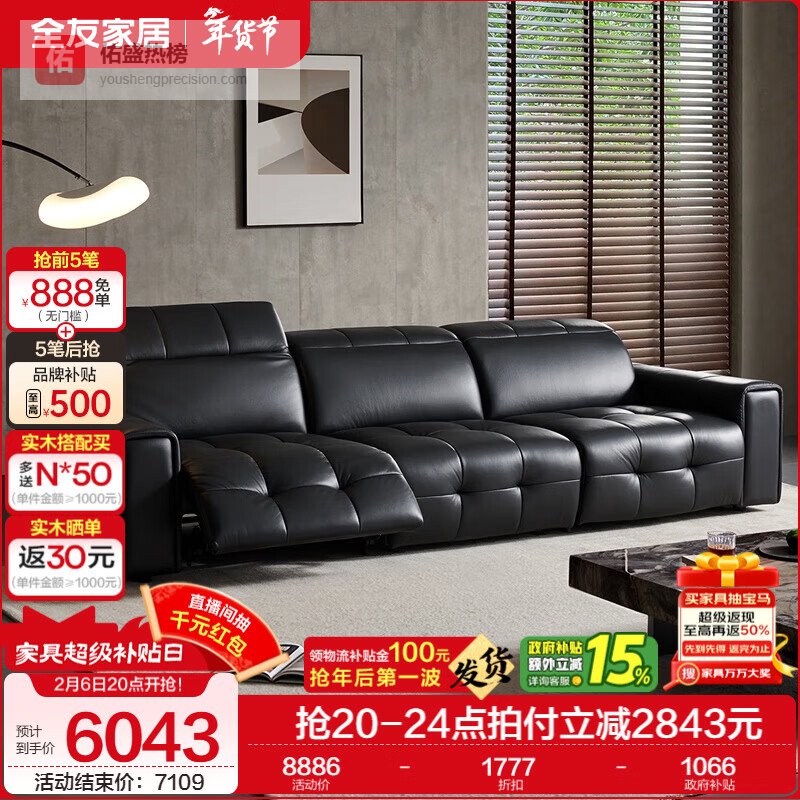 全友家居意式极简电动功能沙发头层牛皮真皮沙发劳伦三人位直排沙发 【暗夜黑|牛皮(轻功能款)】3.12m单功能位沙发¥