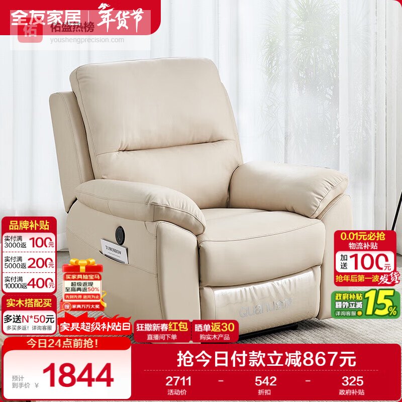 全友家居 多功能单人位电动沙发家用客厅头层牛皮真皮沙发家具 ¥