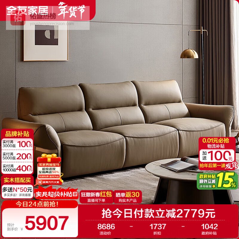 全友家居 头层牛皮多功能电动真皮艺沙发客厅直排式三人位沙发家具¥