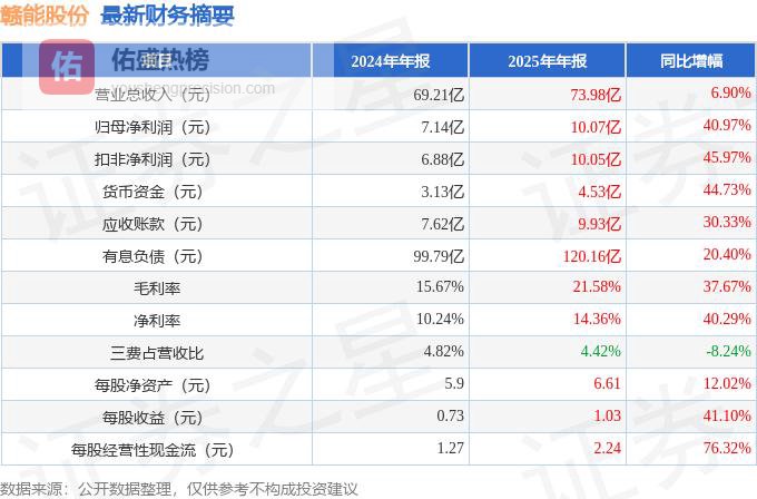 据证券之星公开数据整理,近期赣能股份(000899)发布2025年年报。截至本报告期末,公司营业总收入73.98亿元,同比上升6.9%,归母净利润10.07亿元,同比上升40.97%。按单季度数据看,第四季度营业总收入22.29亿元,同比上升22.81%,第四季度归母净利润1.36亿元,同比上升81.15%。本报告期赣能股份盈利能力上升,毛利率同比增幅37.67%,净利率同比增幅40.29%。