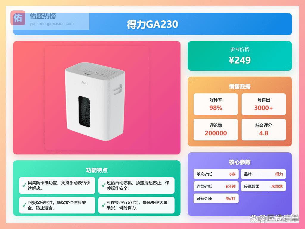 1000元内碎纸机性价比高的推荐:这3款耐用又高效,推荐口碑好的型号一、得力1️⃣ 安全碎纸效果:这款得力GA230可以把纸和订书钉都碎成米粒大小的碎屑,确保你的重要信息不会被轻易拼凑出来,4级保密标准让你用得放心,资料安全不用担心泄露。