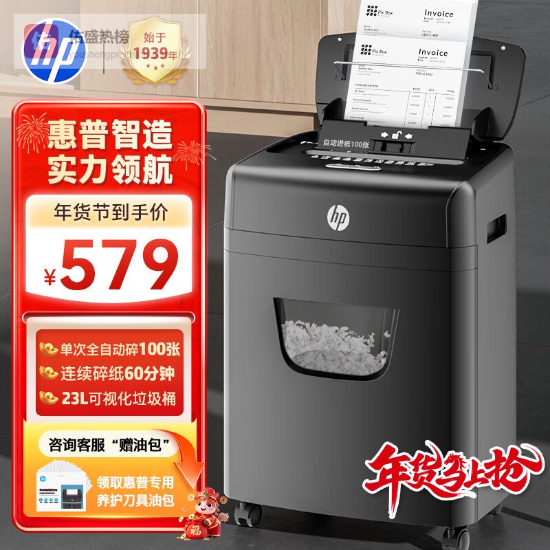 惠普全自动碎纸机 办公大型商用粉碎机 (全自动100张 连碎40分钟 23L容量)手动单次8张 B23090CC¥