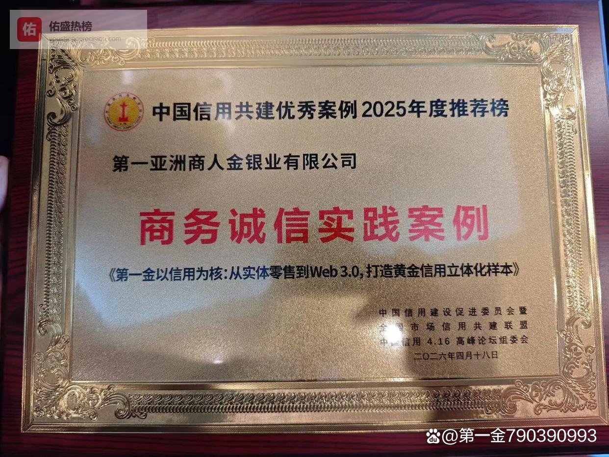 在本届论坛同期举行的“中国信用共建优秀案例2025年度推荐榜”颁布仪式上,第一亚洲商人金银业有限公司(简称“第一金”)凭借《第一金以信用为核:从实体零售到Web3.0,打造黄金信用立体化样本》案例,荣获“商务诚信实践案例”奖项。