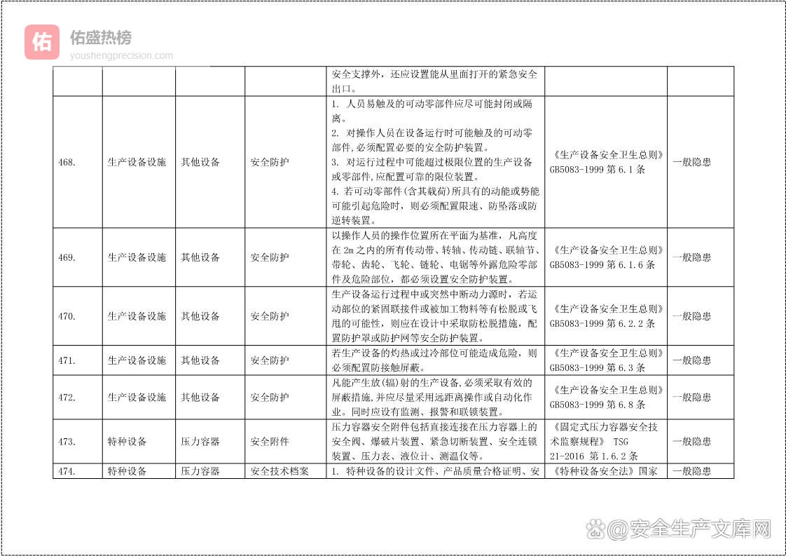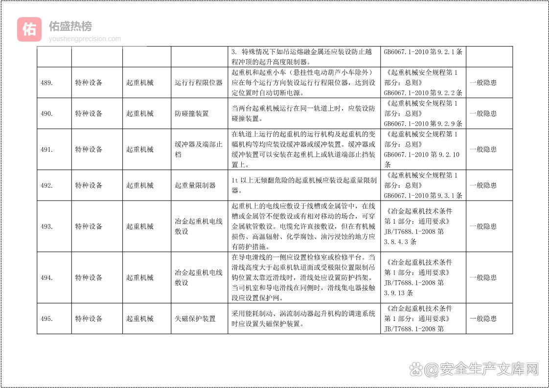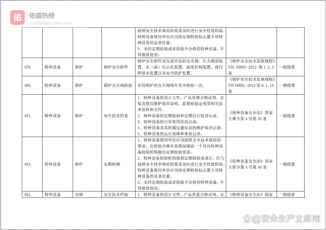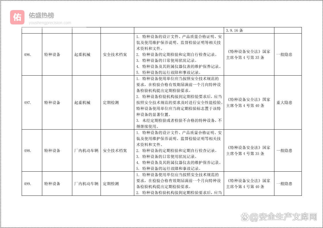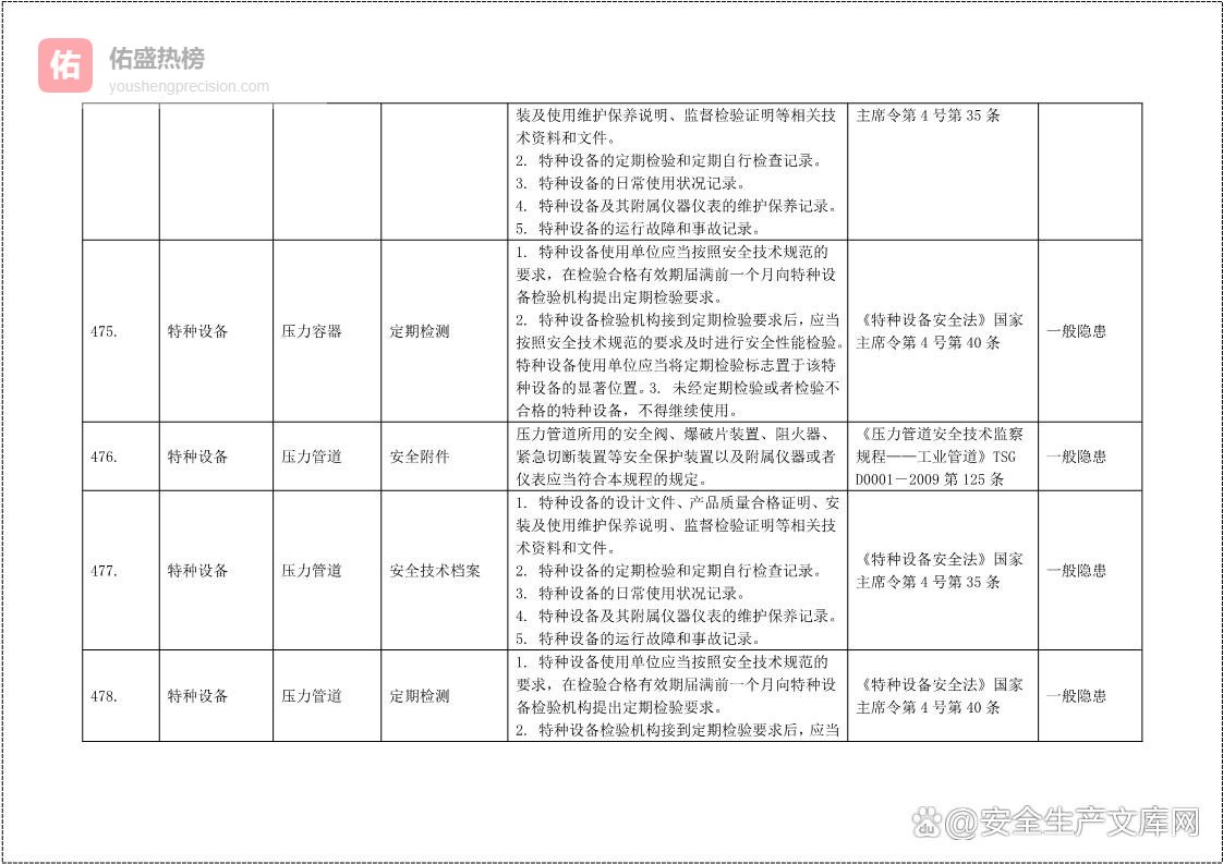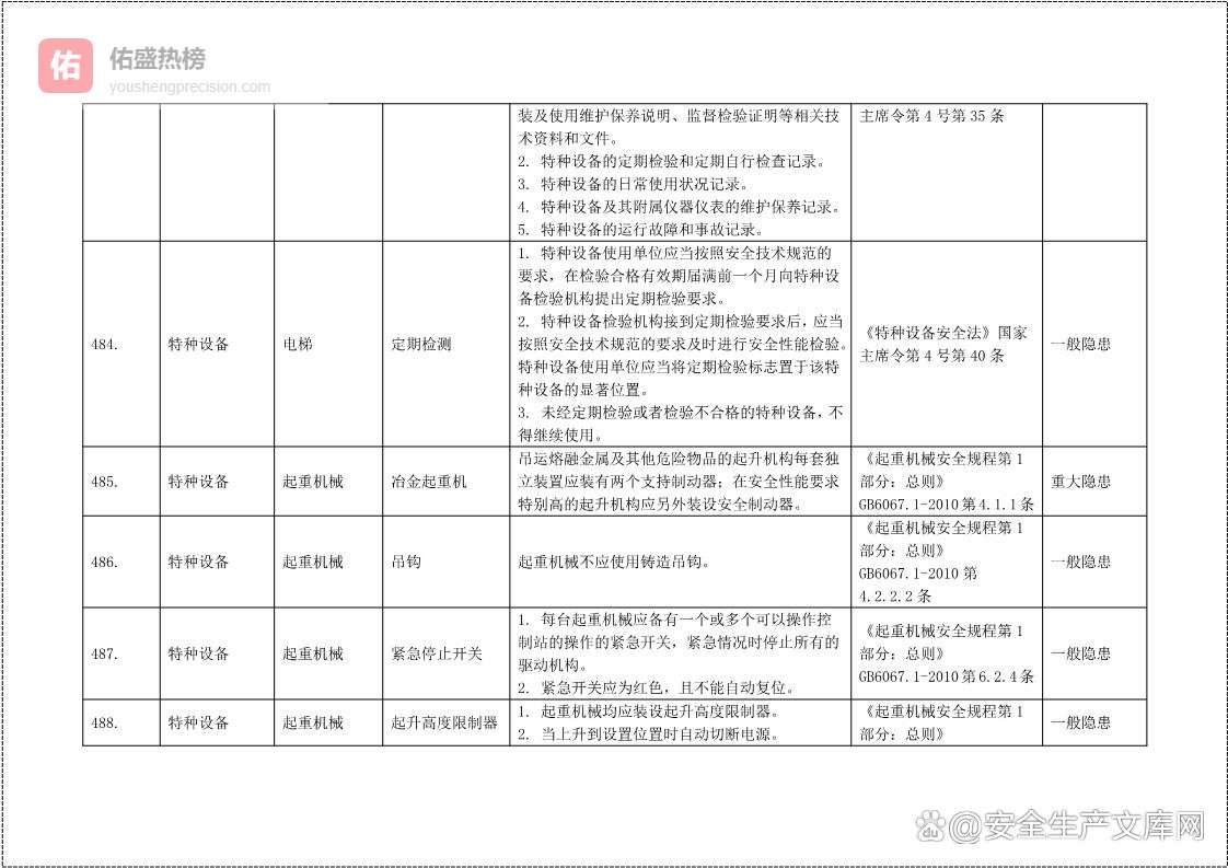 (四)特种设备安全包含压力容器、压力管道、锅炉、电梯、起重机械、厂内车辆的安全附件、检测、档案管理要求。标注起重机械未定期检测等重大隐患条款。
