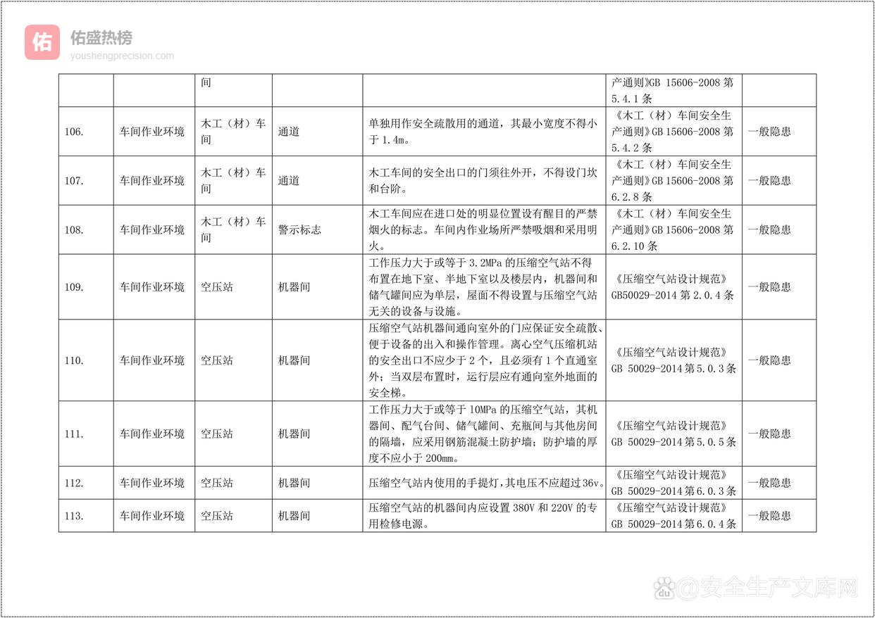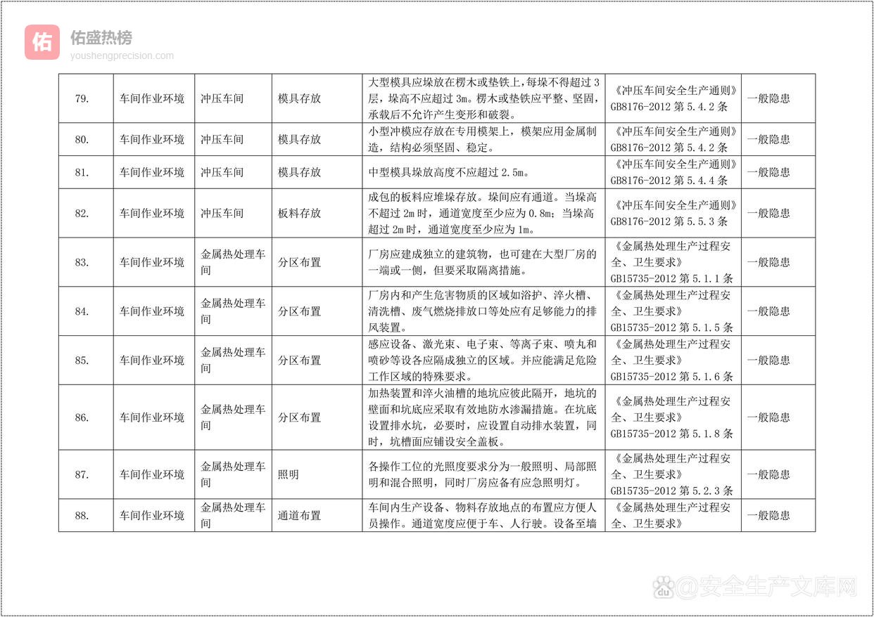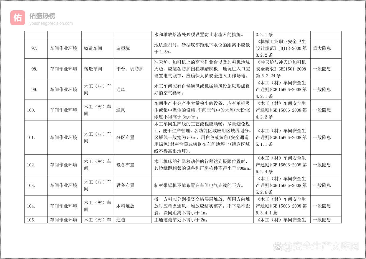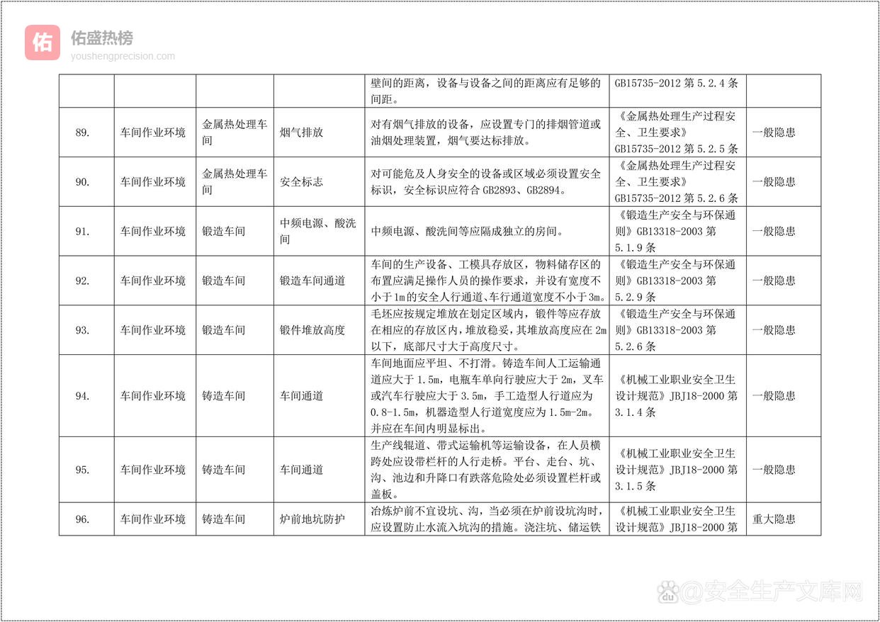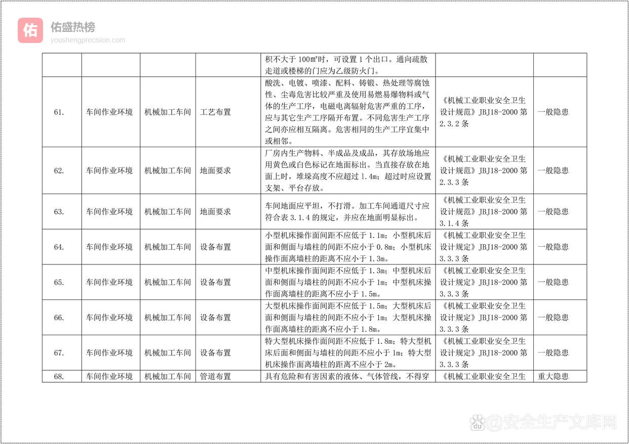 (二)车间作业环境安全细分机械加工、冲压、热处理、铸造、木工等车间的布局、通道、地面、防护要求。明确重大隐患判定标准,如危险管线穿越禁区、铸造炉前防水措施等。