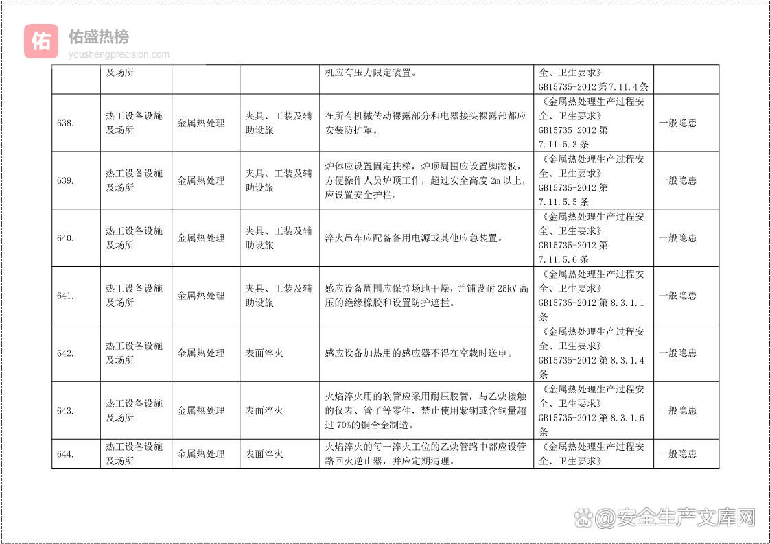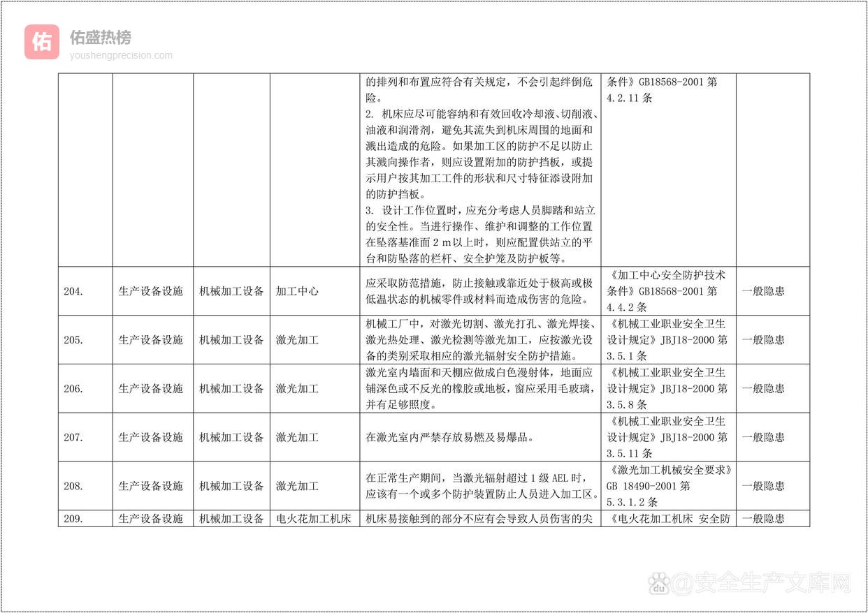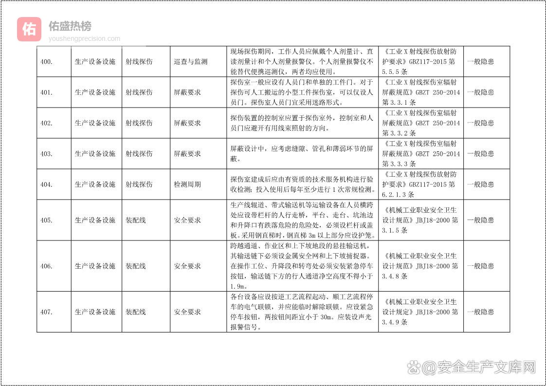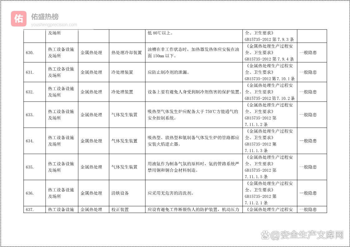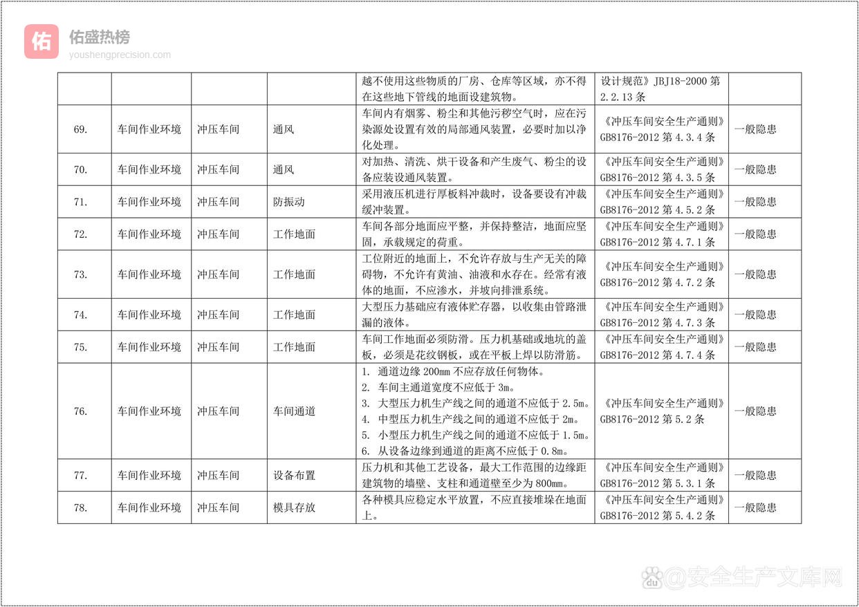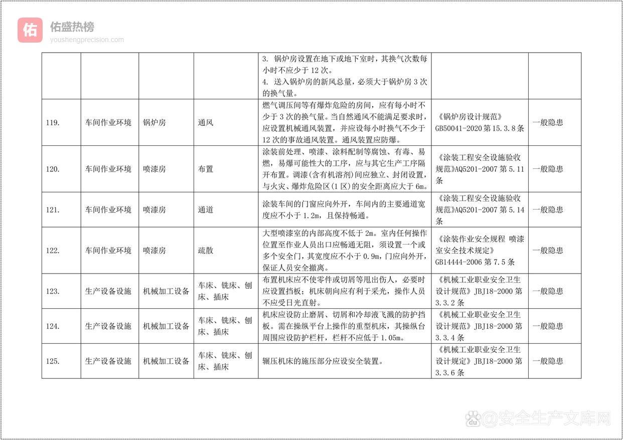 (二)车间作业环境安全细分机械加工、冲压、热处理、铸造、木工等车间的布局、通道、地面、防护要求。明确重大隐患判定标准,如危险管线穿越禁区、铸造炉前防水措施等。