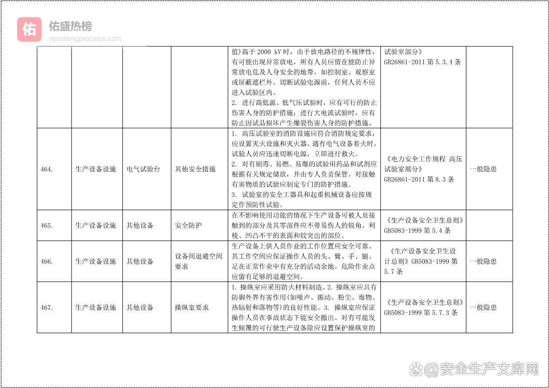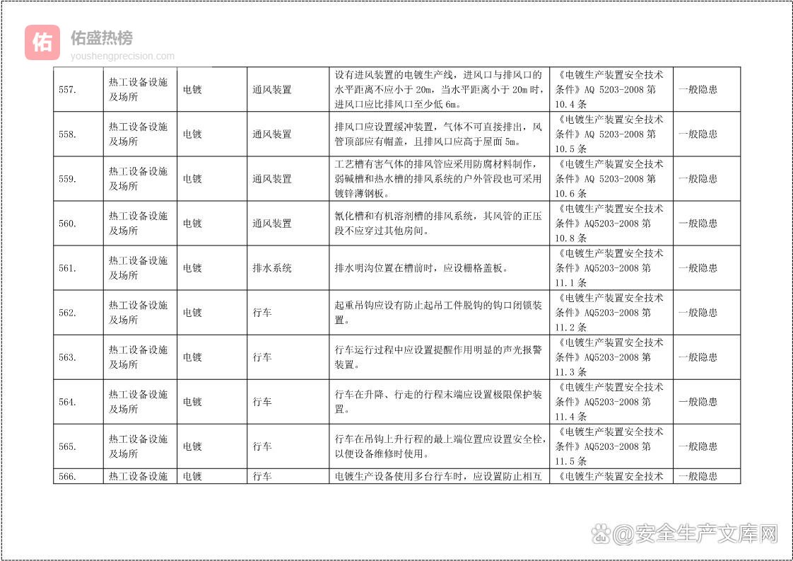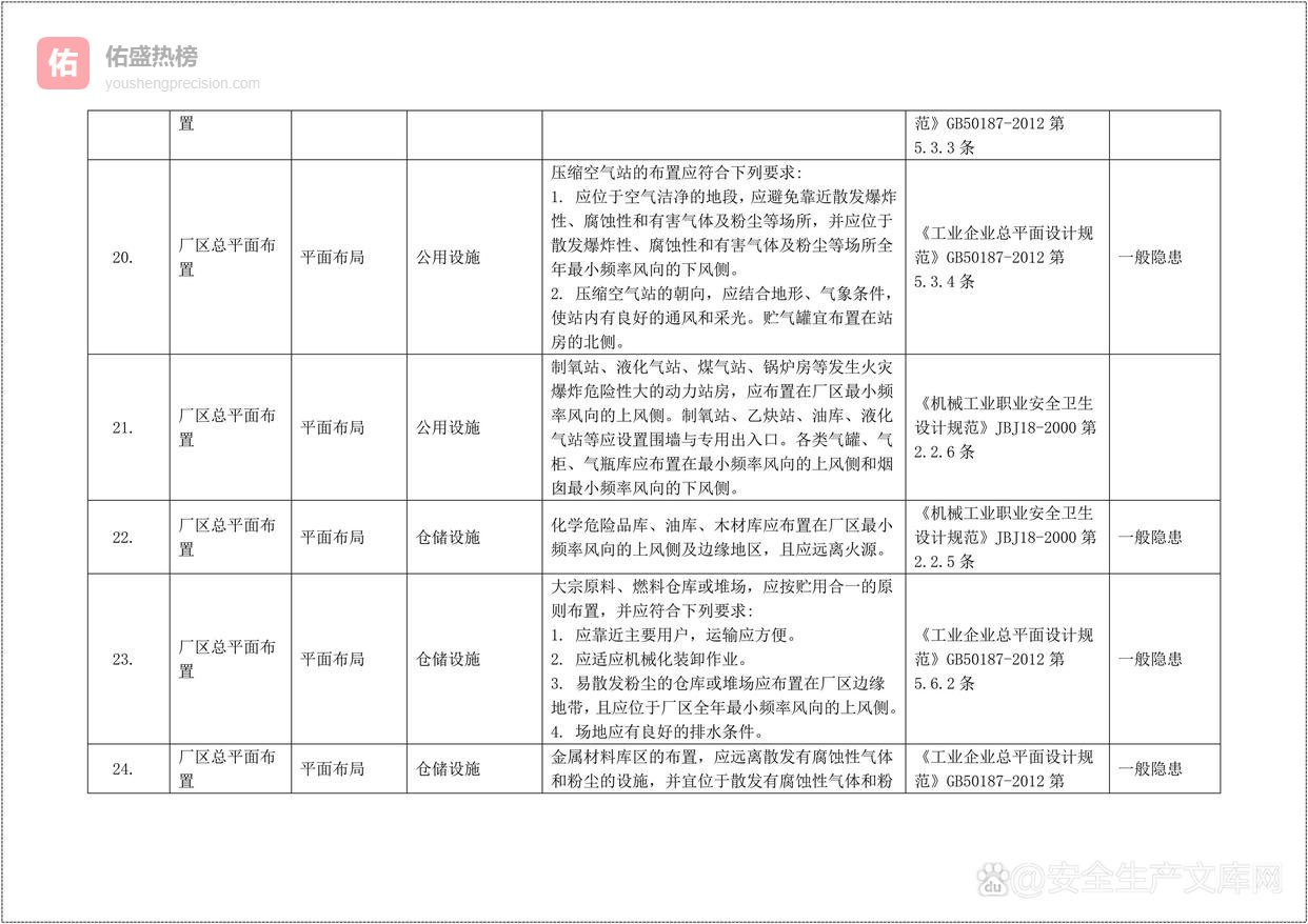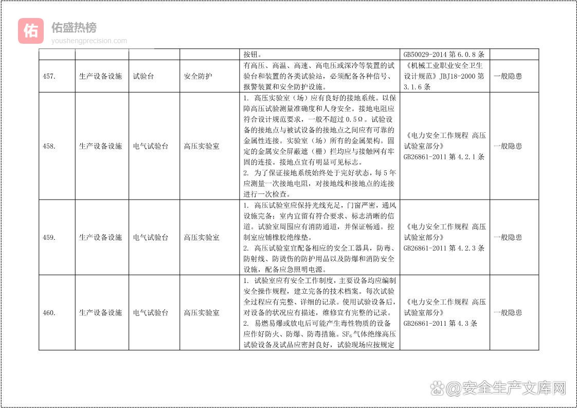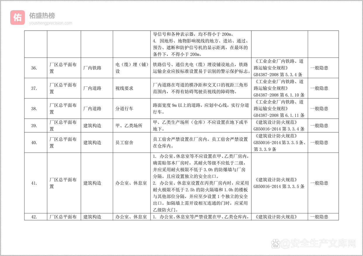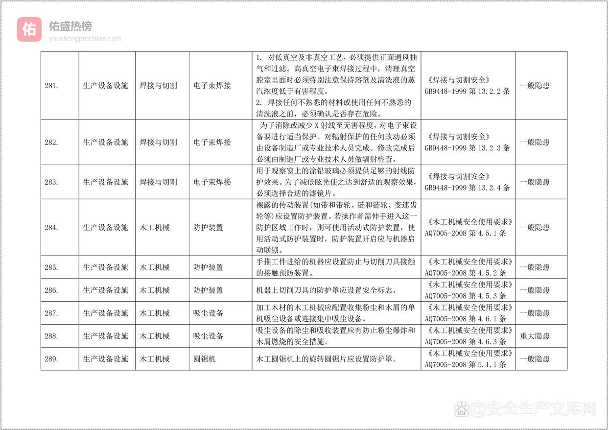 (二)车间作业环境安全细分机械加工、冲压、热处理、铸造、木工等车间的布局、通道、地面、防护要求。明确重大隐患判定标准,如危险管线穿越禁区、铸造炉前防水措施等。