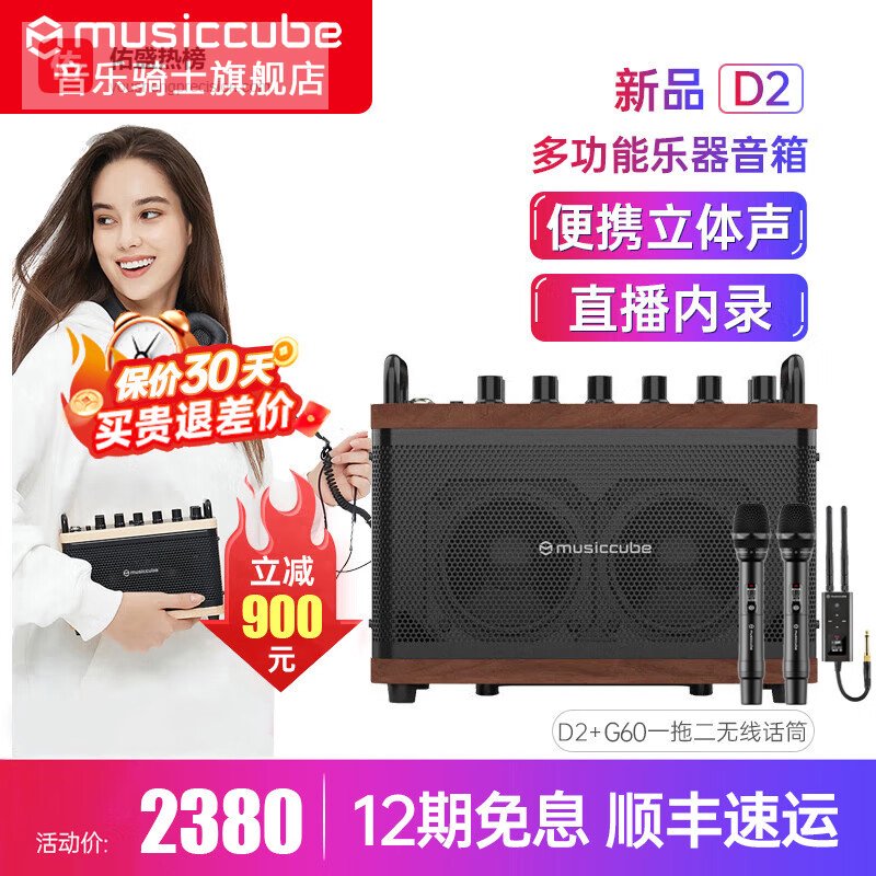 音乐骑士D2乐器音箱无弦吉他弹唱电吹管萨克斯专用便携蓝牙直播内录音响 D2橡木棕 G60一拖二无线话筒¥
