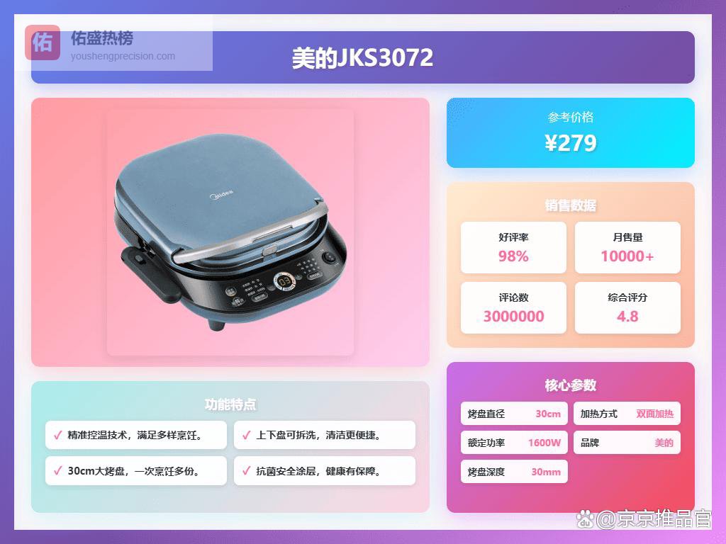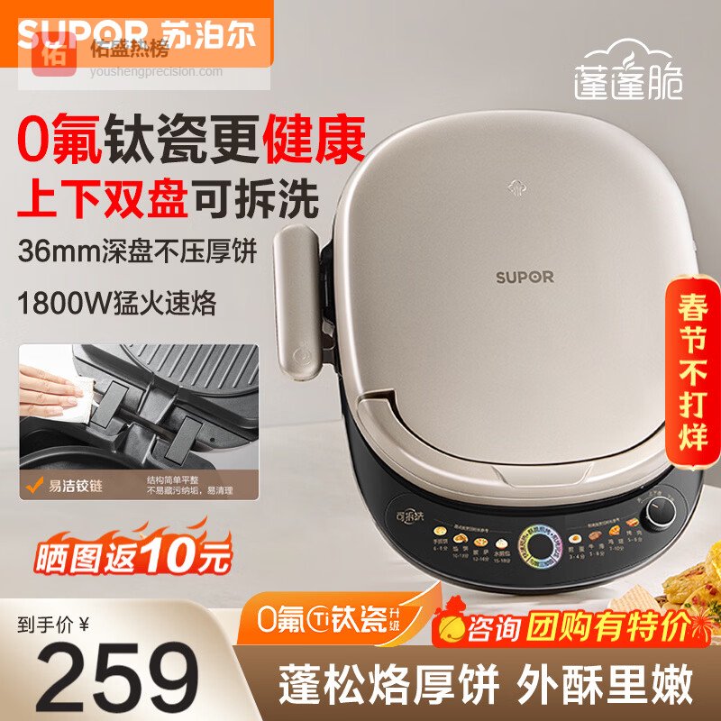 点评:这款苏泊尔电饼铛新款的最大亮点就是上下盘都能拆卸,清洗起来特别方便,不用担心油污残留,让卫生更到位。再加上双面加热,食材两面同时受热,烹饪时间显著缩短,效率还不错。