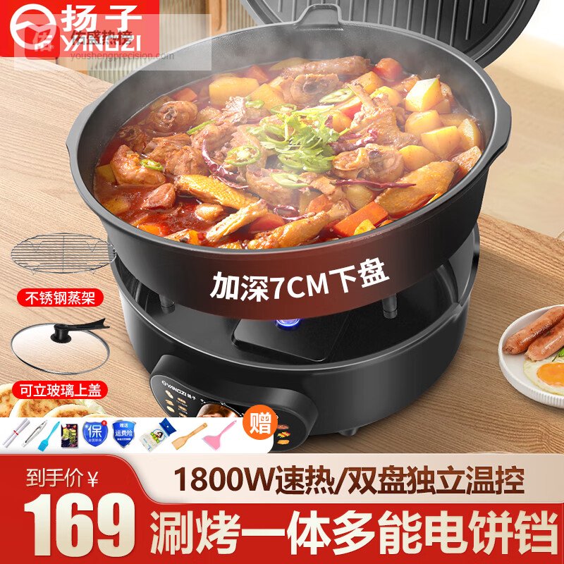 扬子电饼铛家用双面加热煎饼锅分体下盘加深7cm可拆洗调温煎烤机30CM早餐机电煎锅涮烤一体火锅电饼档 旋钮控温【30cm 7cm深】下盘可拆+礼包¥