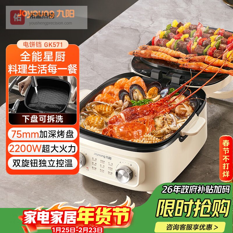 九阳(Joyoung)一机多能电饼铛三明治机早餐机75mm深盘大火力多功能电火锅下盘可拆洗烤肉锅GK571¥
