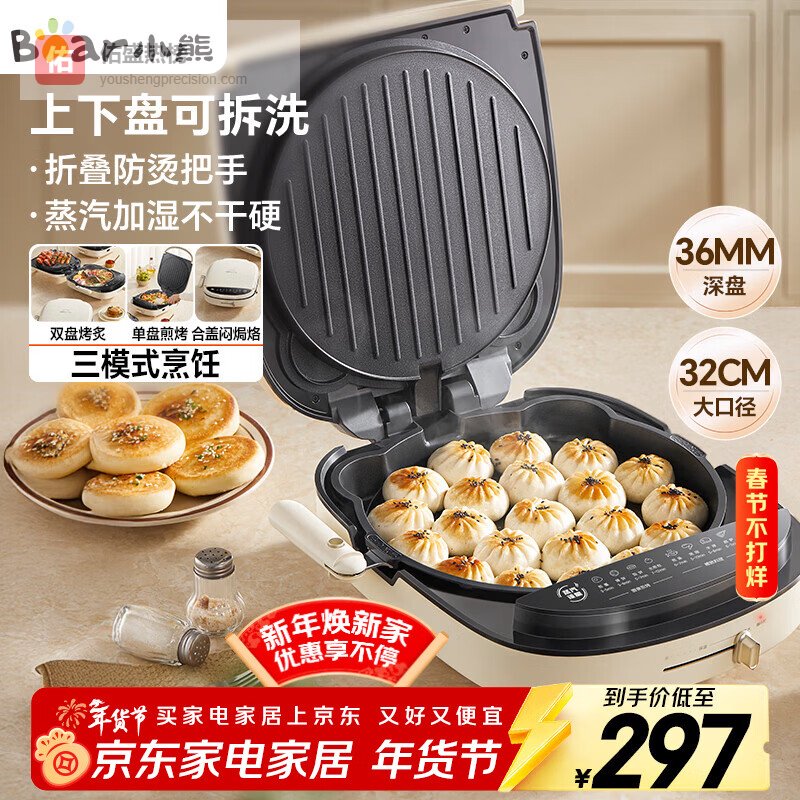 点评:这款小熊电饼铛确实挺方便的,双面同时加热,大大提高了烹饪效率。不用等太久,食材很快就能熟透,省时省力。上下盘都可以拆掉清洗,不用担心藏污纳垢,保持卫生更简单。它的36mm加深盘,能装下更多的食材,比如水煎包都没问题,做饭更灵活。