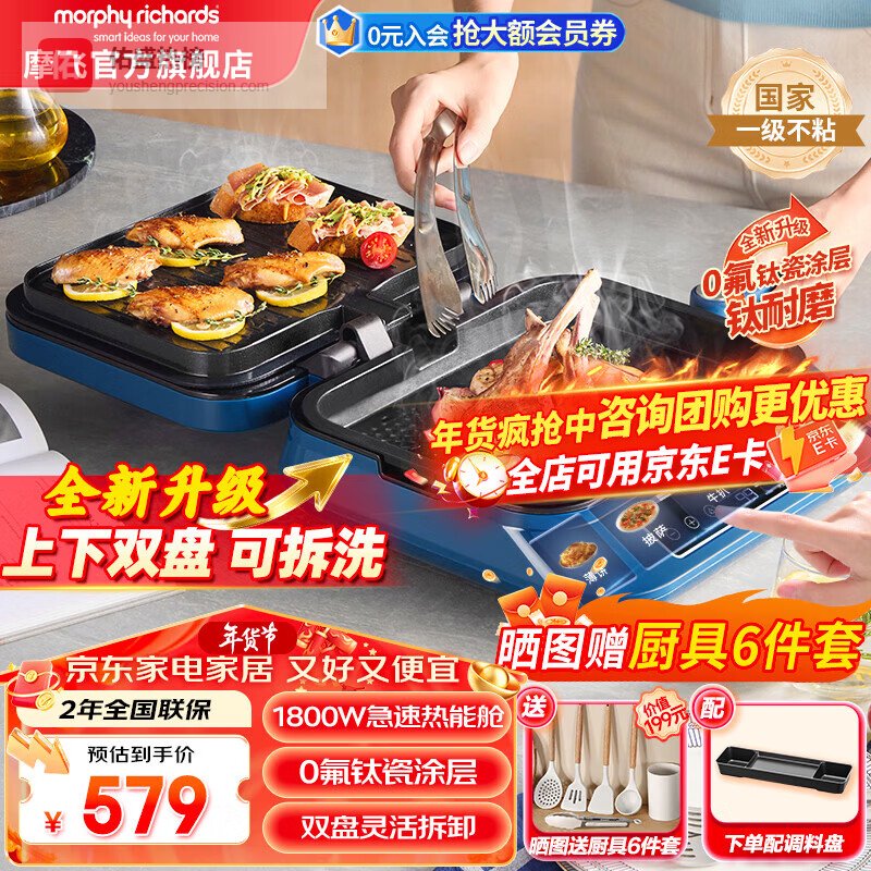 摩飞电器(Morphyrichards)电饼铛家用上下可拆洗 多功能早餐机电饼档双面加热加大加深煎烤机大火力烙饼三明治机0氟钛瓷涂层 轻奢蓝【30mm深盘丨0氟钛瓷涂层丨双盘可拆洗】¥