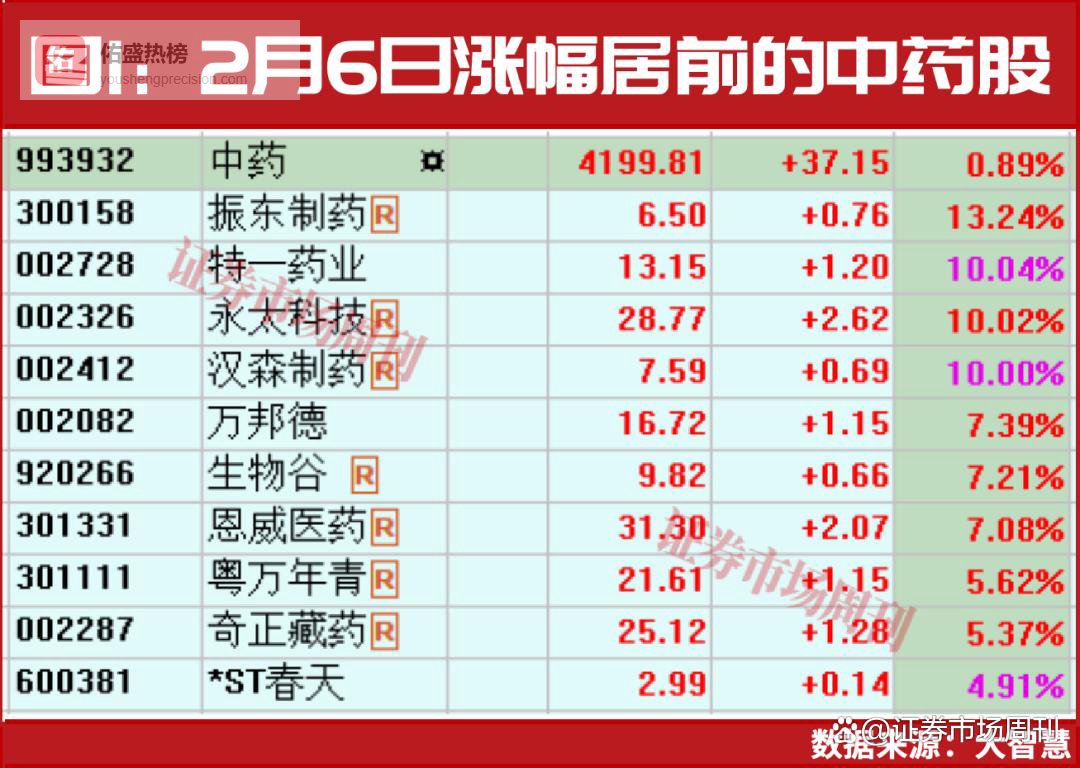 再看中药板块,主打一个“稳健逆袭”。2月6日,行业整体领涨市场,特一药业、汉森制药等强势触及涨停,恩威医药、万邦德等公司也涨幅居前,板块内个股大面积飘红(见图1),中证中药指数亦稳步上涨。