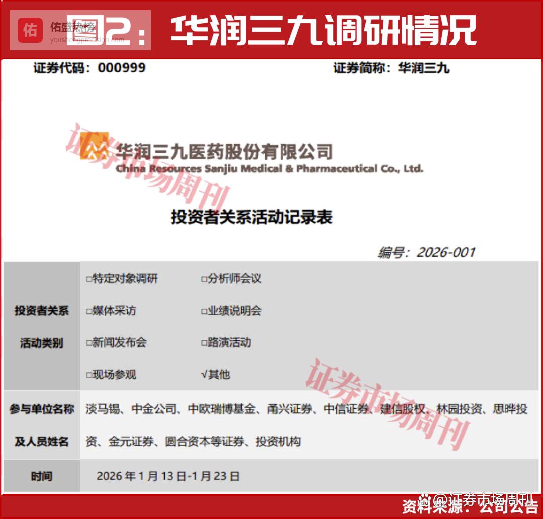 1月13日-1月23日华润三九的调研活动中,林园投资与淡马锡、中金公司等10余家机构同台考察,对公司进行了详尽调研(见图2)。