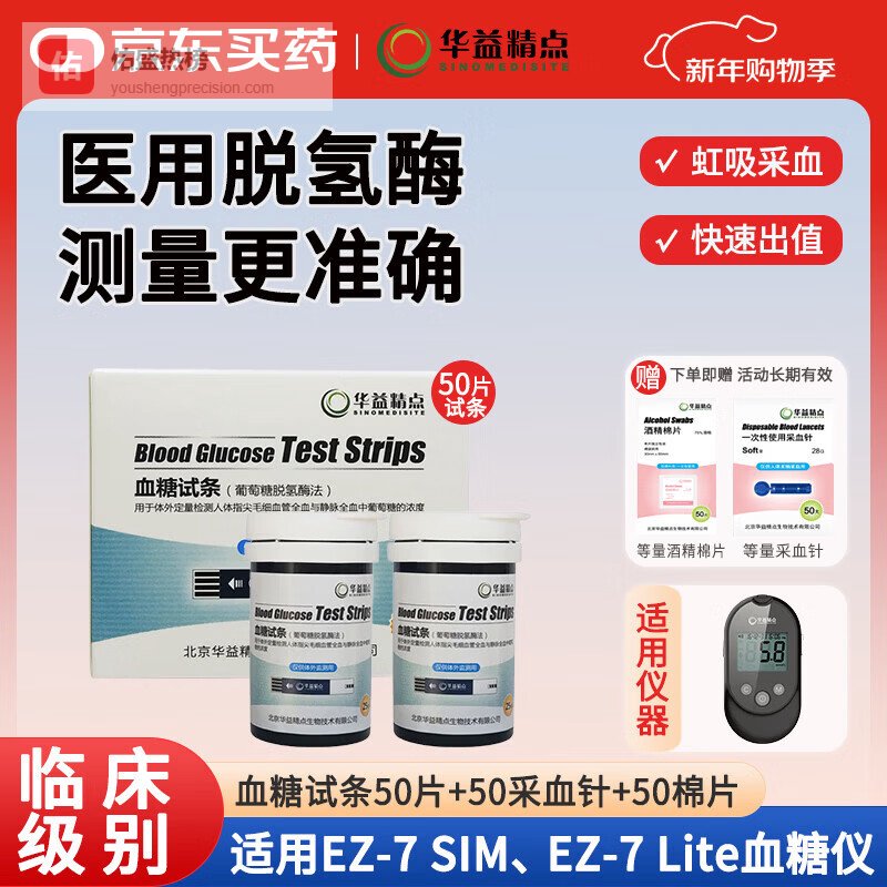 点击链接,直享优惠:华益精点EZ-7血糖仪套装,含50条试纸+50针棉,居家监测更省心