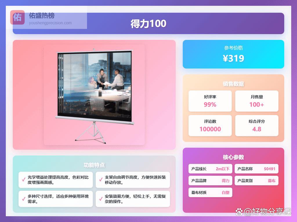 2026年买什么幕布最好用,性价比排行榜推荐一、得力得力50491幕布采用可升降设计,轻松调节高度,无论是桌面会议还是大空间投影,都能找到合适位置。它的4:3黄金比例,兼容多种电子设备,投影画面更舒服,看的更尽兴。白塑材质,色彩还原度高,长时间使用也不易变形,画面稳定不跑偏。