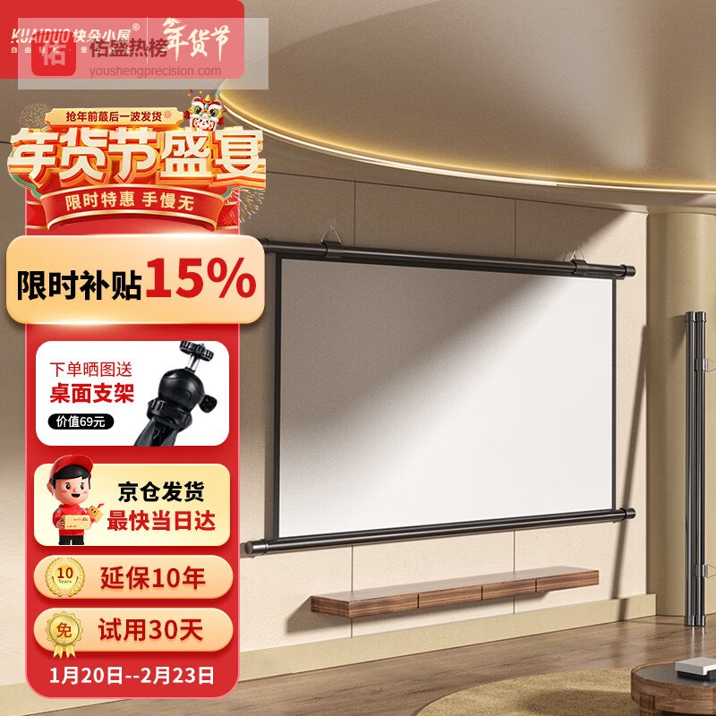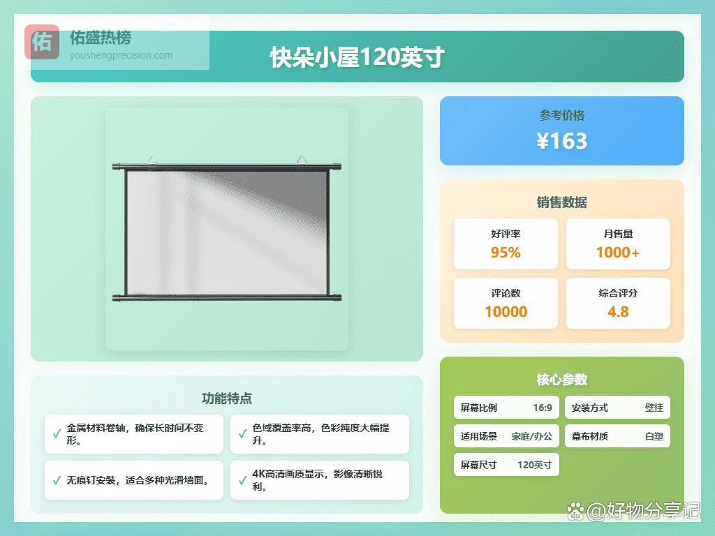 六、快朵小屋这款快朵小屋白塑挂壁幕布,支持4K高画质和3D显示,画面清晰细腻,色彩亮丽得像给你打了色彩浓缩剂。PET材质厚度只有0.22毫米,既柔韧又抗皱,用久了也不用担心卷边变形。自动修复功能帮你解决可能的皱折困扰,投影时不用担心“皱纹满布”的尴尬。