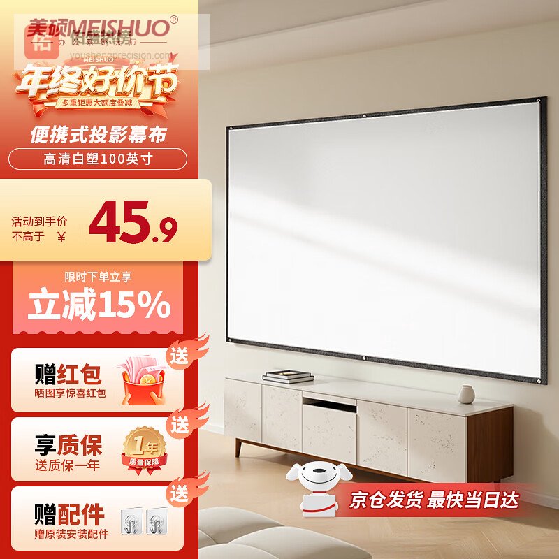 美硕(MEISHUO)家用幕布100英寸16:9白塑挂壁幕高清简易安装支持移动便携适配户外极米坚果小米当贝爱普生飞利浦¥