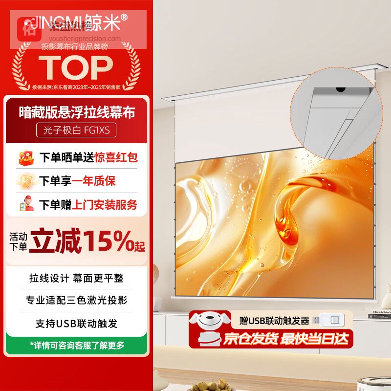 鲸米(JINGMI)92英寸智能光子幕布暗藏悬浮版FG1XS极白电动拉线投影幕布智能联动双电源适配三色激光投影仪¥