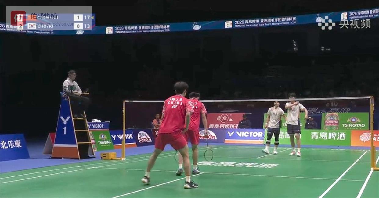 真正的风暴在第四场男双对决中彻底爆发。 07年出生的陈俊廷和搭档刘峻荣甫一登场,就展现出与年龄不符的老练。 面对韩国组合赵松炫/奇东柱,两人从开局就掌控节奏:陈俊廷在网前编织的"死亡之网"让对手频频失误,刘峻荣在后场的重杀更是虎虎生风。 当比分来到15-9时,韩国组合试图通过变速突击扭转局面,但中国小将们用眼花缭乱的平抽挡化解危机。 21-15、21-14的悬殊比分,让青岛体育中心沸腾成欢乐的海洋。