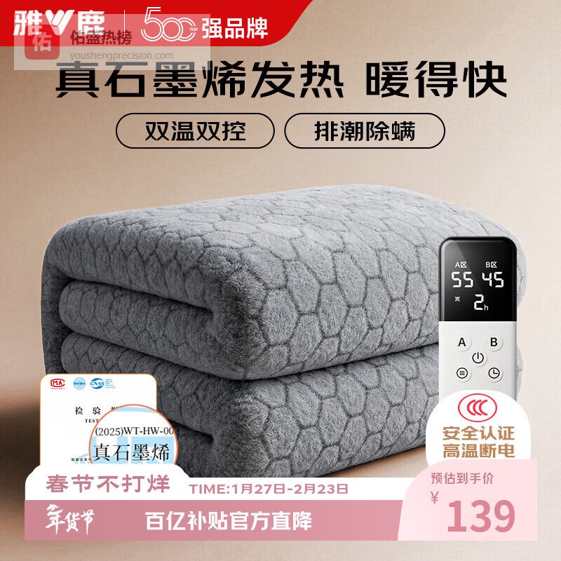 【品牌直营】雅鹿【速热NO.1】石墨烯电热毯单人双人电褥子1.8米x2米双温双控水暖加厚暖绒【1.8¥