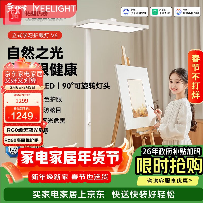 【京东自营】Yeelight易来落地护眼灯V6卧室书房儿童学习灯智能金黄光LED阅读灯¥