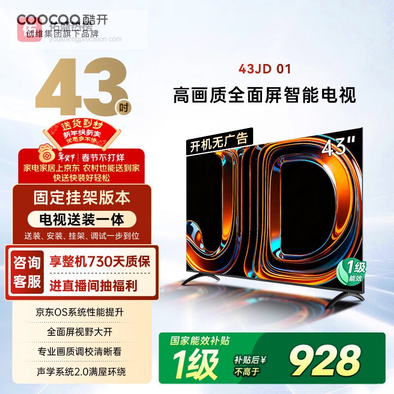 这款酷开43JD 01系列电视采用高画质全面屏设计,屏占比达97%,带来更宽广的视觉体验,观看时更沉浸。配备全高清分辨率,细节还原度高,画面清晰细腻。支持60Hz刷新率,虽非极高但日常娱乐还行,适合家庭普通观影需求。
