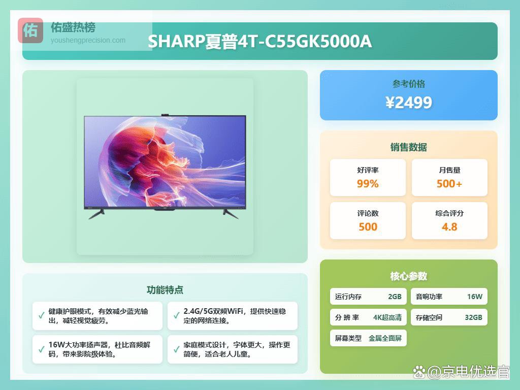 在音频方面,SHARP 4T-C55GK5000A配备了多扬声器系统,支持杜比音频解码,能带来更丰富的环绕音效,不会差;声音还行,但如果追求极致音质可能还需外接音响。其能效等级为四级,在保证良好画质的同时,也考虑到了节能环保,比较适合普通家庭长时间使用。支持多应用、多内容源,无缝连接家庭网络,体验丰富多彩的智能娱乐。整体来说,这款电视的功能配置比较实用,性价比还可以,适合追求稳定体验的用户。