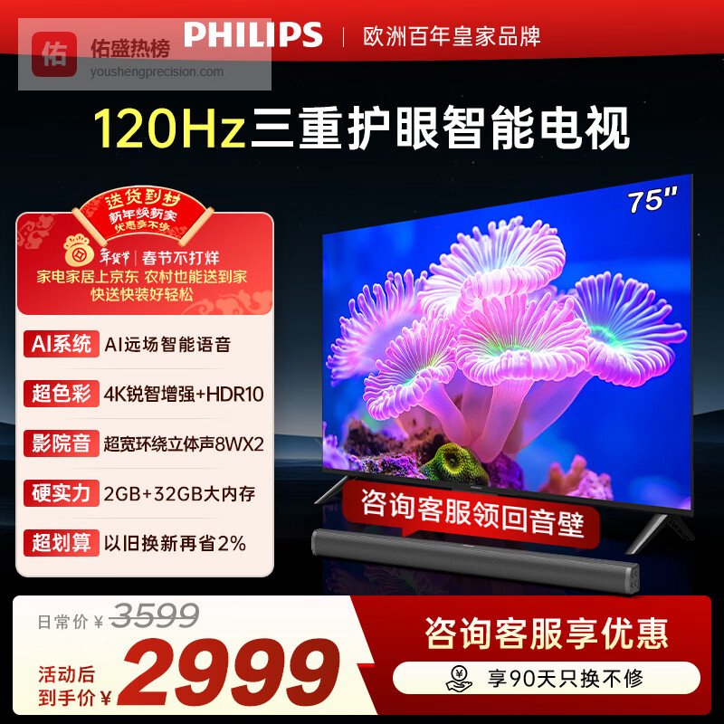 飞利浦(PHILIPS)经济款 75英寸4K超高清护眼全面屏120Hz高刷 远场AI语音智能液晶平板电视机 75PUF7590/T3¥