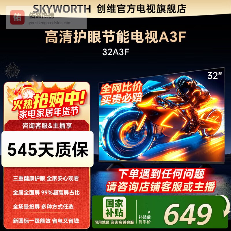 创维电视32英寸 32A3F 高清护眼 金属全面屏 智能投屏 三重硬件护眼 显示器 液晶平板电视机 一级能效 32英寸 32A3D升级款¥