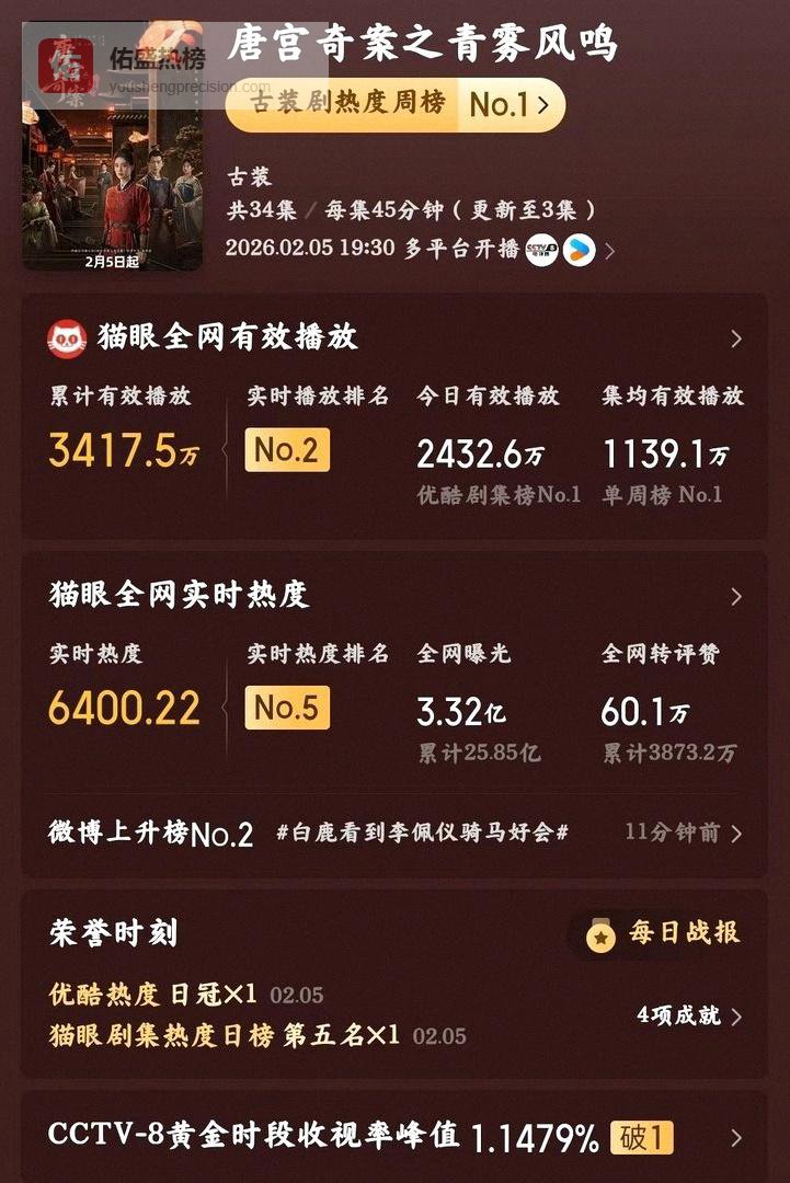 《唐宫奇案之青雾风鸣》2月5日登陆央视八套、优酷、Netflix,预约超400万,首晚优酷热度冲至8000-9000区间,央视收视峰值约1.3%,但评论区迅速撕裂,赞妆造与打戏、批逻辑和台词并存