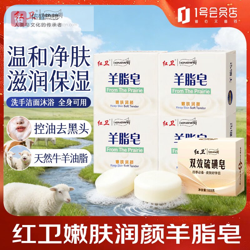 红卫羊脂皂4块(赠硫磺皂) 洗脸洗澡沐浴肥皂男女士用老牌国货手工香皂¥