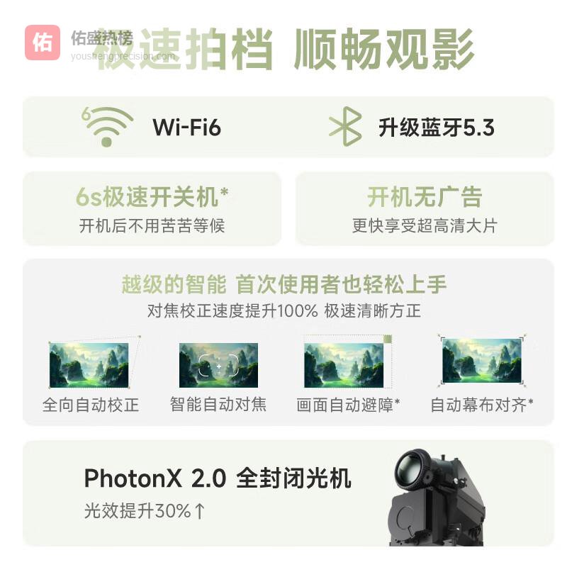 4️⃣智能自动对焦技术:配备智能自动对焦,提升对焦速度100%,有效减少调试时间。同时,它还实现了自动避障和自动幕布对齐功能,简化了操作过程,让用户专注于精彩内容。